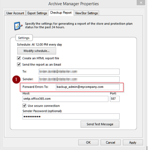 From the Archive Manager node, select Properties and open the Checkup Report property page. There is now a new Forward Errors To field (@1) where you can add one or more recipients that will receive a copy of the Checkup Report only when new errors or warnings are detected. Use a comma to separate email addresses or leave the field blank if you don’t want to use this particular feature. The alternate recipient will receive the email when the scheduled checkup report runs and an error or warning is detected.