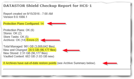 The new Checkup Report now has summary information in the header about the other sections of the report. It is intended to be compact and brief, and this information often will show in email preview, which is handy when checking the report from a smartphone, for example. This information includes the number of plans configured, and how many of those plans actually ran, and if any errors or warnings are indicated.
