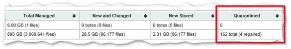 Quarantined keeps a running total of quarantined data and any of those items subsequently repaired. New quarantined items are flagged as errors if they weren’t immediately repaired. Generally, the occurrence of quarantined items are rare, and may indicate otherwise undetected disk or network errors. As disk capacities increases the probability of an occurrence of a disk corruption increases and there’s an increased likelihood that these would go undetected by the operating system. The Store verify task can be used to scan new and changed data as well as performing full data scan of all content to identify any and all disk corruptions. Consider running low-level file system checks like chkdsk or running the SAN or NAS disk utilities supplied by your device manufacturer, if you see a sudden increase in quarantined items. Your backup storage may need to be replaced if you see a continued increase in quarantined items.