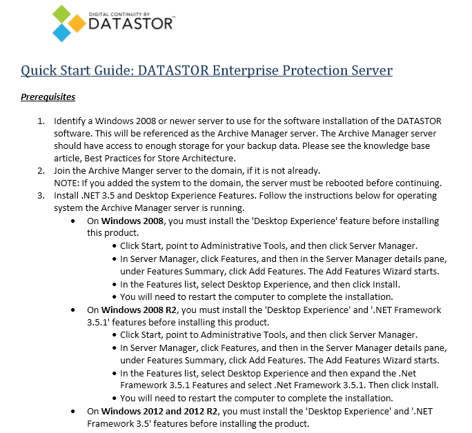 Our QuickStart document will lead you through the steps to prepare a server and install Enterprise Protection Server, then configure a store and protection plan. It is designed to give you a quick introduction to the product. From here you can further your understanding of the product by experimenting with different settings and referring to the online documentation via the context-sensitive Help buttons. It assumes you have the setup program and necessary license keys.